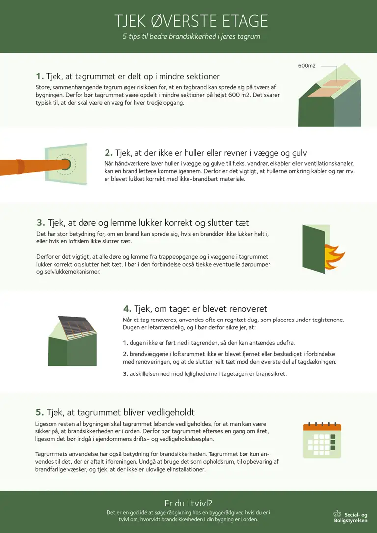 Vi har gjort det nemt for dig at tjekke, om tagrummet i din etageejendom er brandsikret. Her er en tjekliste, som du kan printe eller bruge på mobilen. Tag den med dig, når du tager turen op på øverste etage og gennemgår de 5 tips.
